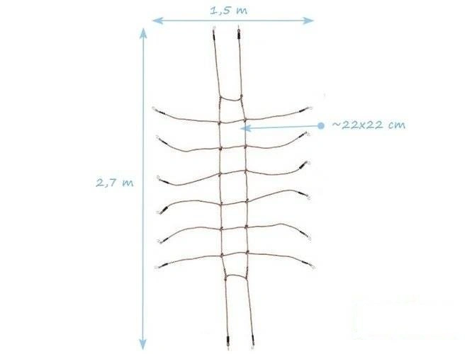 • Kletternetz auf Konstruktion mit Abmessung 1,50 x 2,70 m. Gebrauchfläche der Netz (zwischen zwei Balken) beträgt 0,88 x 2,30 m. Gibt den Kindern eine Möglichkeit die Freizeit auf dem frischen Luft zuverbringen.