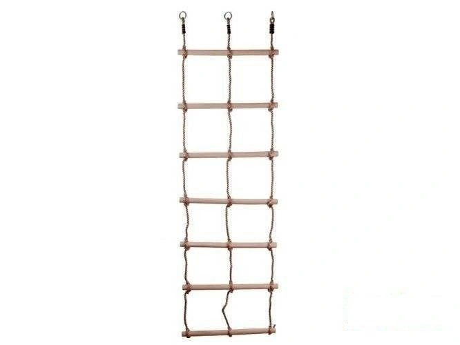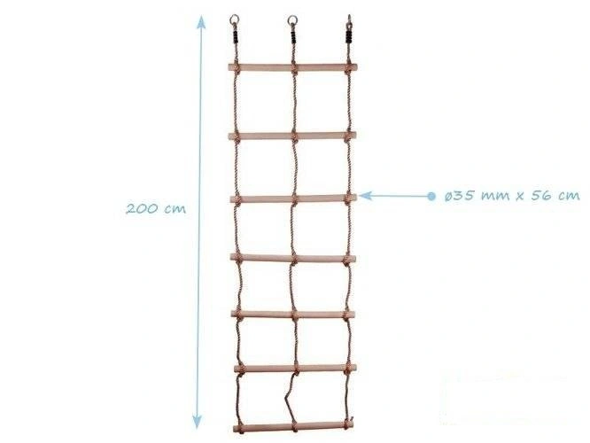 - Doppelstrickleiter mit 7 Holzsprossen. Die Abmessung der Sprossen beträgt 32 x 560 mm, Stärke des Seil 10 mm. Ringe aus verzinktem Stahl gemacht, Länge des Seil 2,00 m.