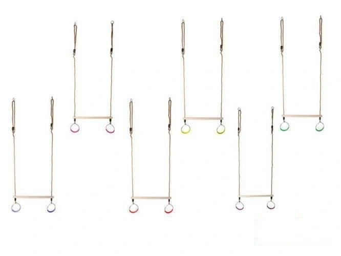 - Hölzernes Trapez mit runden Reifen an Seilen. Eine großartige Möglichkeit, sicheren Spaß mit körperlicher Aktivität zu verbinden.